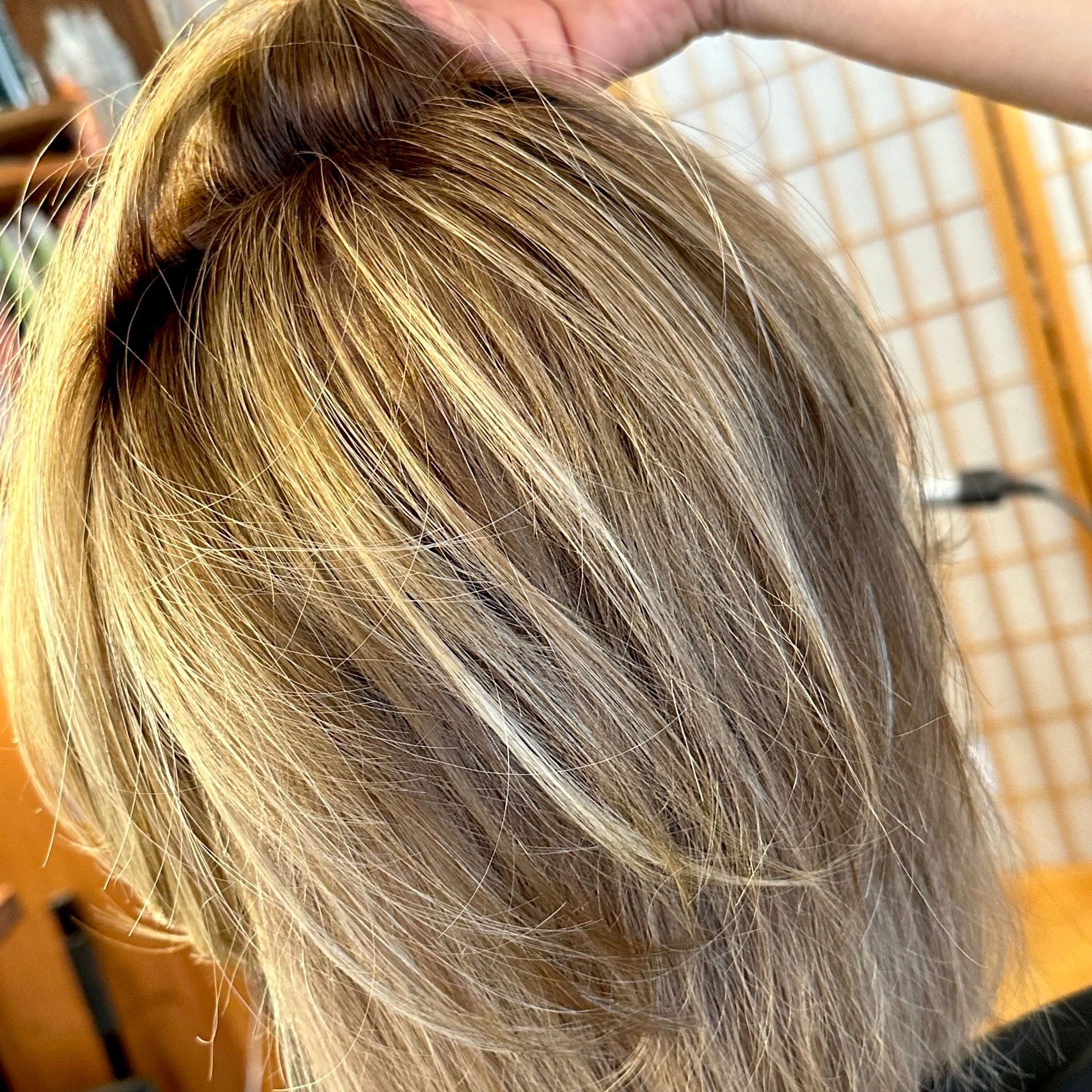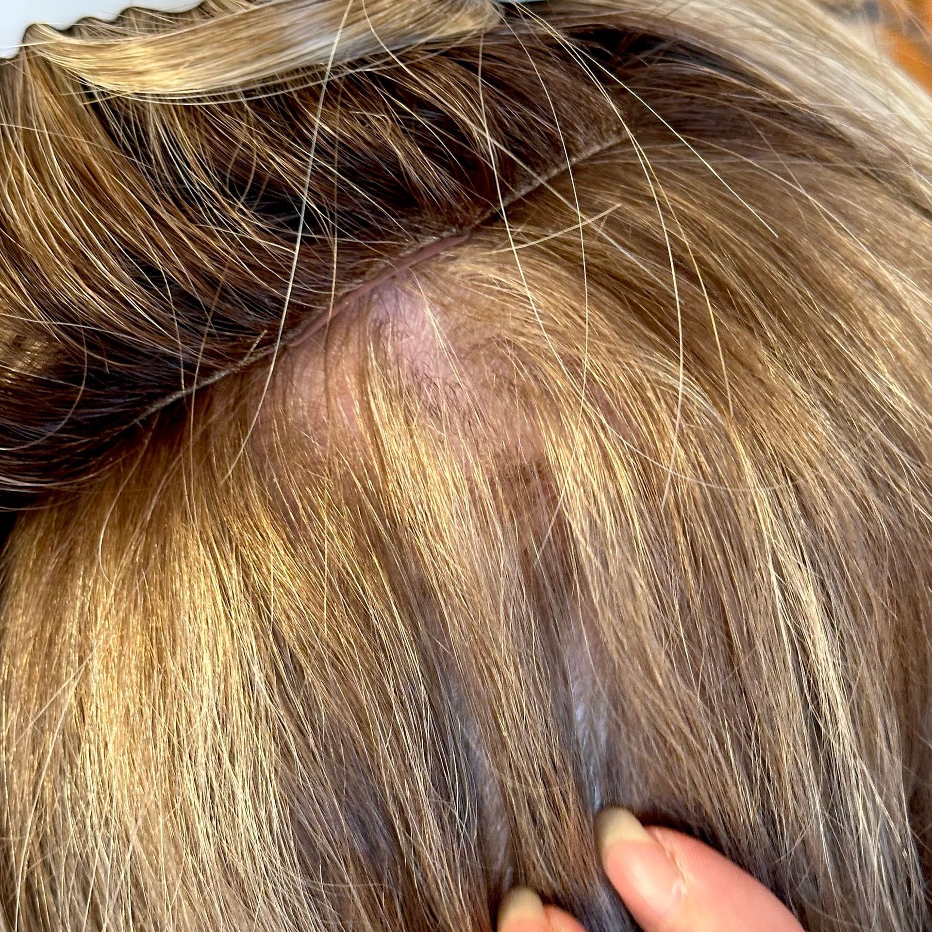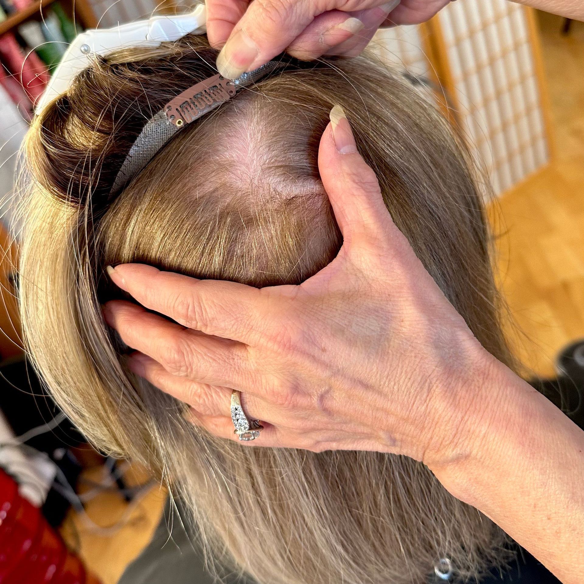 You can see how well this piece blends with our client’s natural hair! This fills in the places where she has hair loss, and allows her to go longer between getting her roots colored because it covers her most visible hair roots. Even as her hair grows, the layered shape of this topper will still blend well.