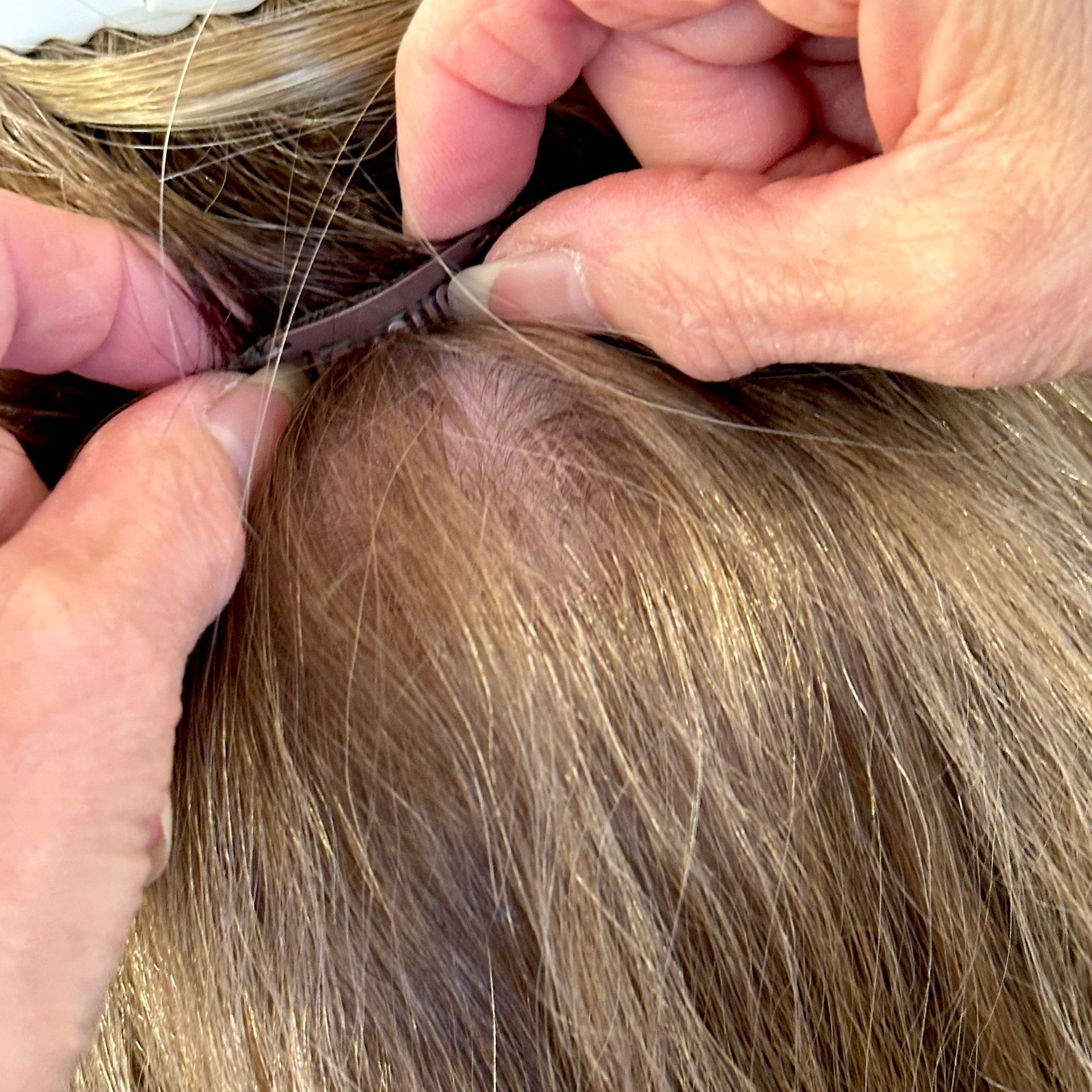 Clip-in toppers are made with clips that attach to your natural hair, like the one we have pictured here. Once the piece is in position the clips snap into place to secure it.